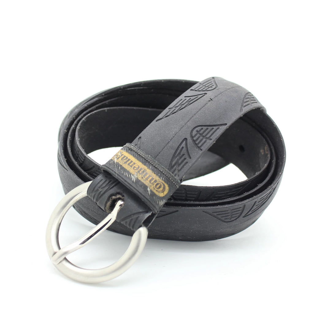 This belt has been created using a well worn road bicycle tire and assembled with a round buckle and a chicago screw for an easy buckle swap