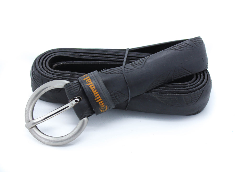 This belt has been created using a Continental road bicycle tire and assembled with a round buckle.